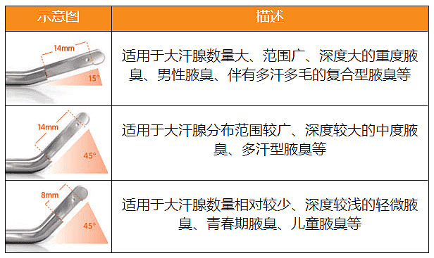 注:由于水动力清创系统水流高速流动,适用于首次治疗患者,并且不同类型的腋臭患者,水刀一次性手柄刀头制作角度不同。